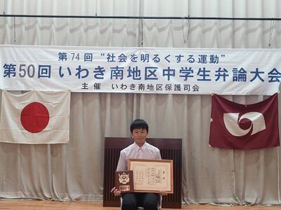 7月13日(土)、泉公民館において開催された【いわき南地区中学生弁論大会】に本校生徒が出場し、『いわき市少年補導員三方部会長賞』を受賞しました。