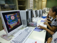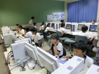 写真は、モニターで通信しながら外国人の先生と英会話のレッスンをしたり、パソコンでビーゴというソフトを使ってゲーム感覚で学習をしたりしているところです。楽しみながら外国語に触れることができています。12月には、ブリティッシュヒルズに行き、学んだ英語を使って生活しています。