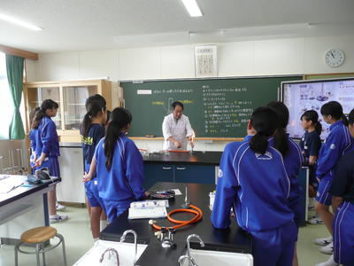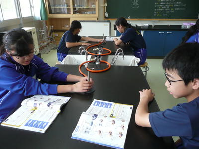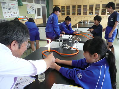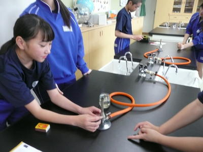 2019年7月16日 11時25分1年理科では、ガスバーナーの使い方。先生の説明と演示を見てから、まず元栓を開かずに手順を確認します。次に、実際にバーナーをつけてみるのですが、マッチで火をつける時は怖々という感じです。赤い炎から空気を調節してきれいな青い炎になりました。