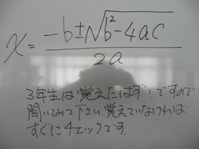 3年生の数学は2次方程式。因数分解や解の公式(懐かしい?)は必須ポイントです。「解の公式、言ってみて」と家庭でもぜひチェックしてみてください。計算の過程をチェックしながら進めています。