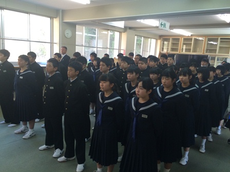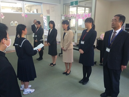 新しい先生方が、正式に着任しました。生徒会長の山廼邉さんから歓迎のことばがありました。