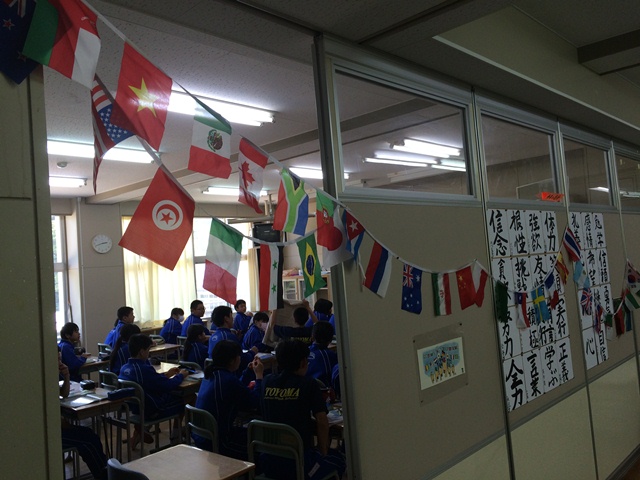 2015年5月15日 10時45分なぜか2年教室は万国旗が掲示してあり、運動会気分上昇中です。