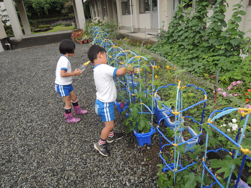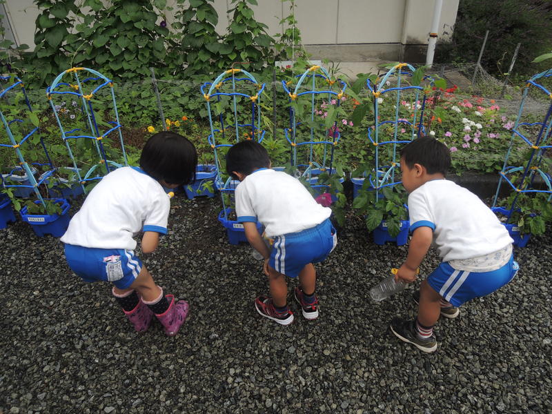 梅雨空ですが朝顔が咲きました。1年生が喜んでいます。