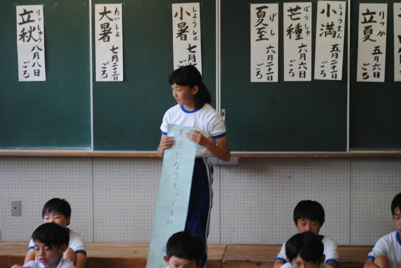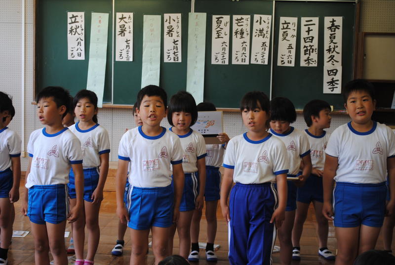 今年度初めての児童集会を行いました。6年生が、24節季について発表してくれました。その後、下学年、上学年の順で、今月の詩を暗唱しました。とても元気に発表できました。