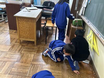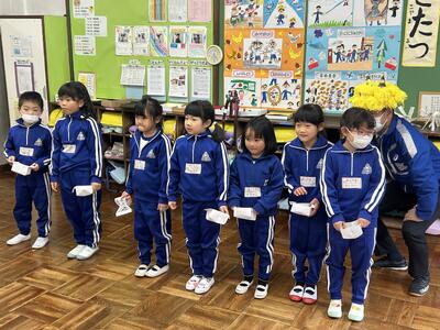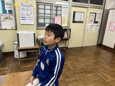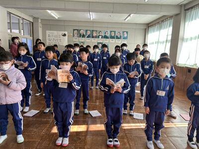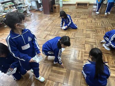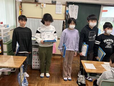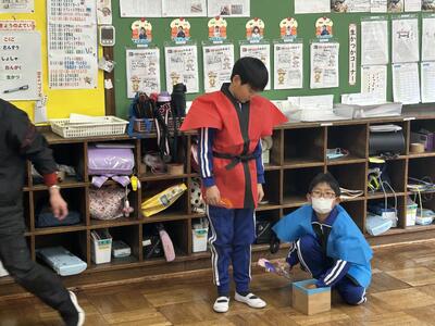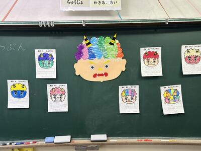 今日は豆まきを行いました。5年生が豆をまきました。全校生の追い出したい心の鬼を退治できるように心を込めてまきました。子どもたちはまかれた豆を一生懸命に拾いました。