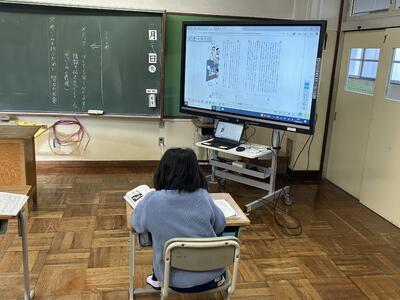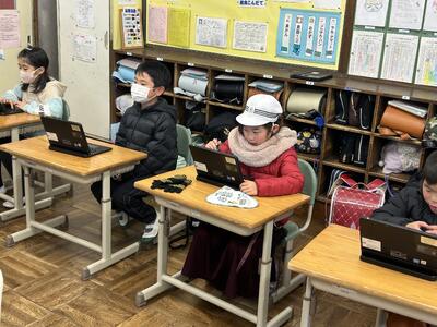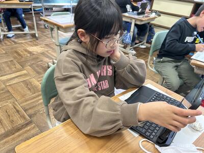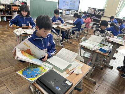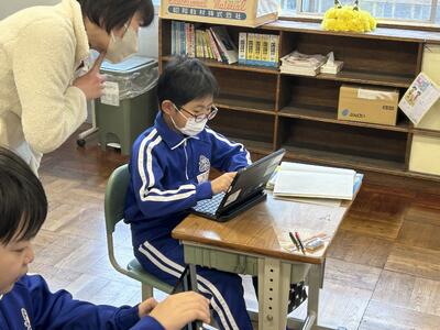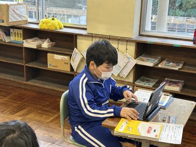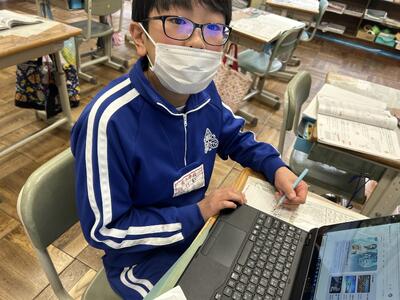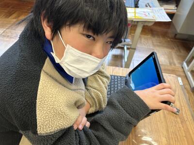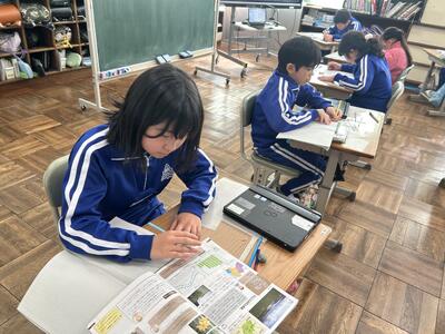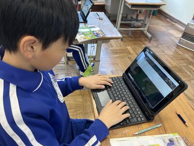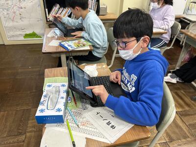 5年生はタブレット端末を使って調べ学習です。ローマ字入力もマスターし、学習用具としてタブレットを使いこなしています。
