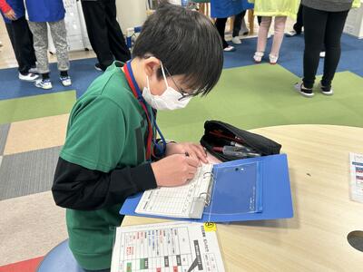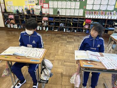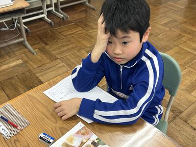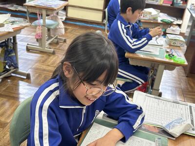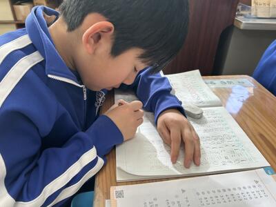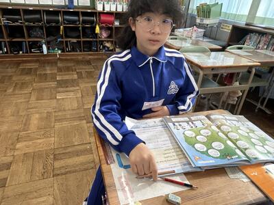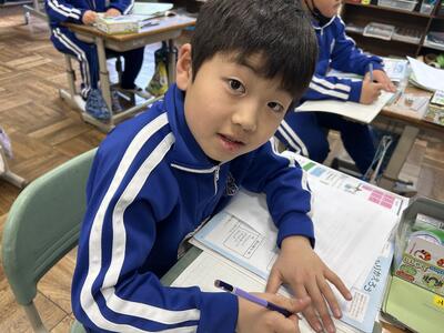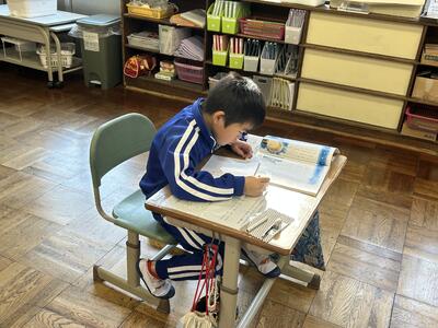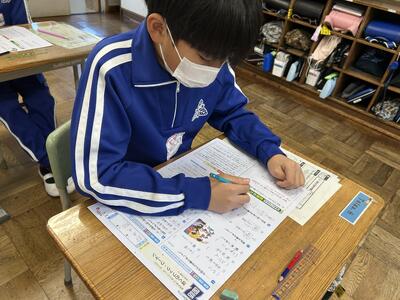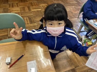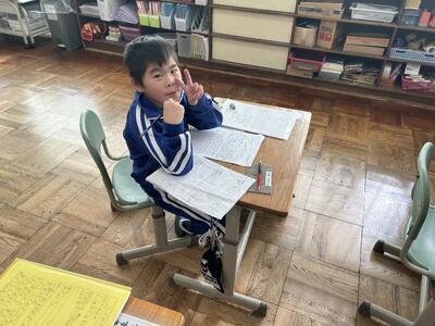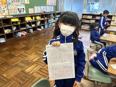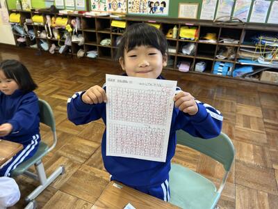 1年生は算数で100ます計算に挑戦しました。10マスをクリアーする時間もだんだん短くなってきました。パーフェクトの児童は誇らしげに答案用紙を見せてくれました。