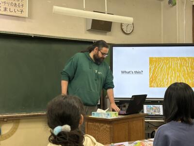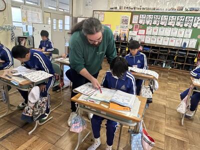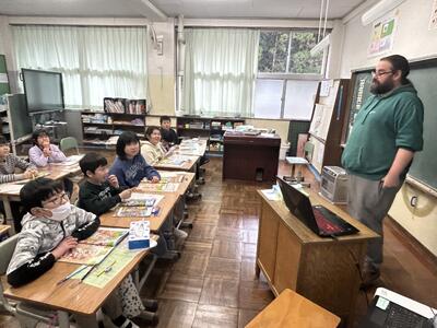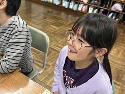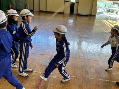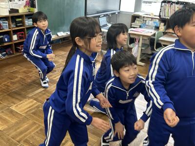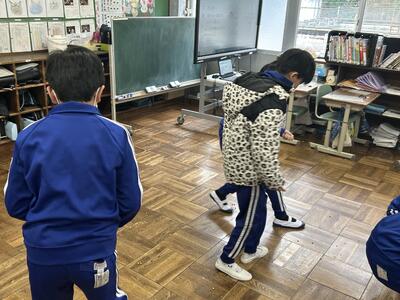 5時間目、3・4年生はジョン先生と英語を楽しみました。「go straight」(真っ直ぐ)「tarn~」(~に曲がる)を学びました。
