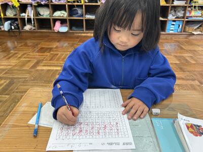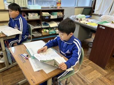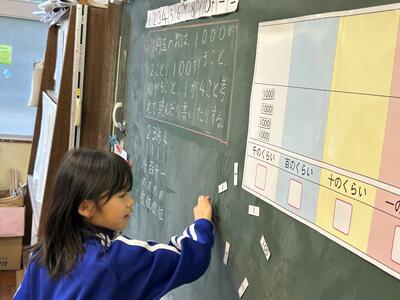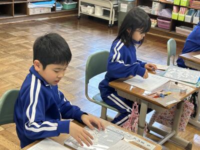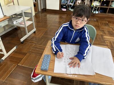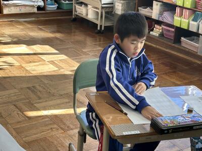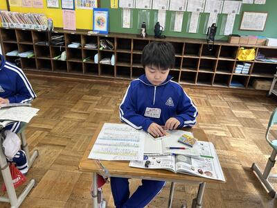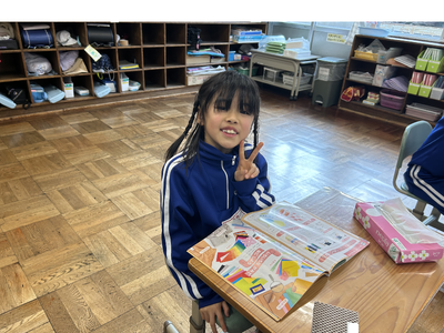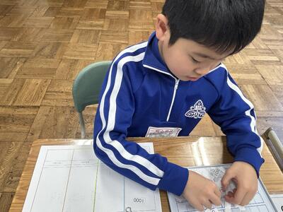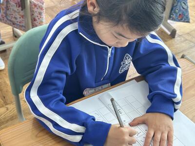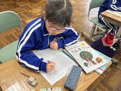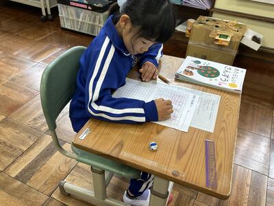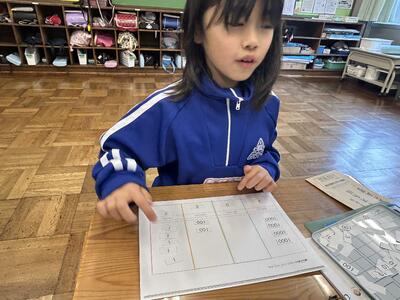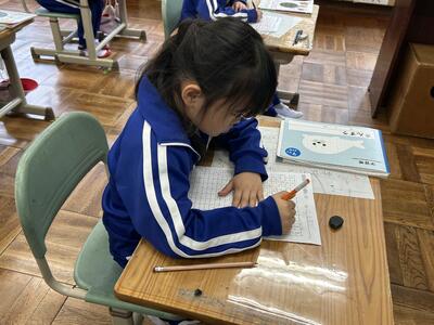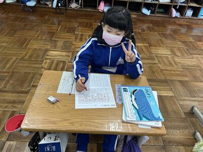 1年生は算数で100ます計算に挑戦しました。10マスをクリアーする時間もだんだん短くなってきました。パーフェクトの児童は誇らしげに答案用紙を見せてくれました。