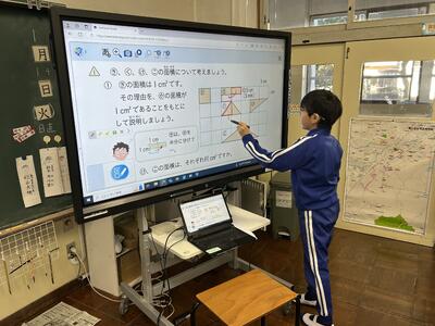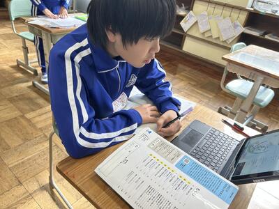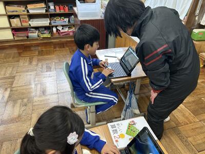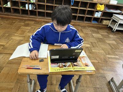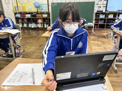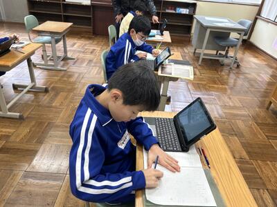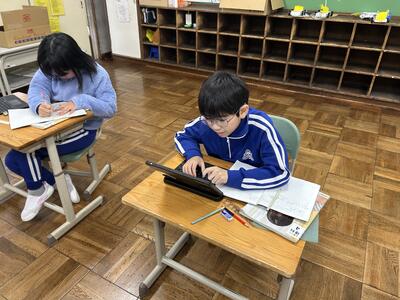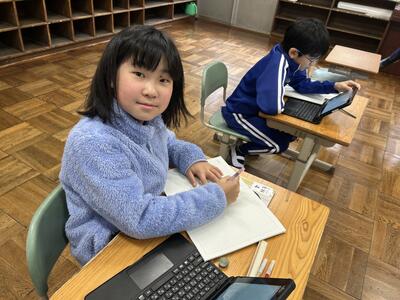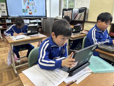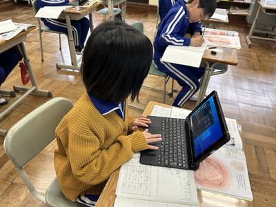5年生はタブレット端末を使って調べ学習です。ローマ字入力もマスターし、学習用具としてタブレットを使いこなしています。