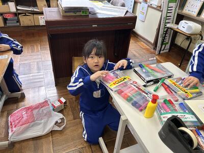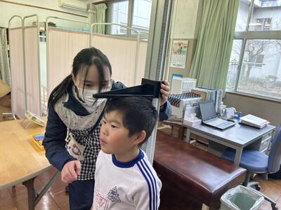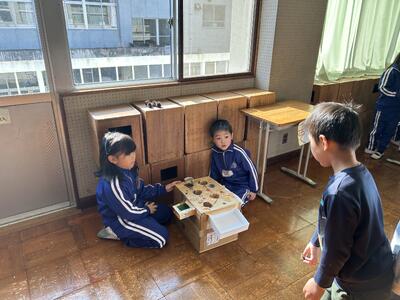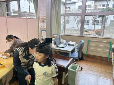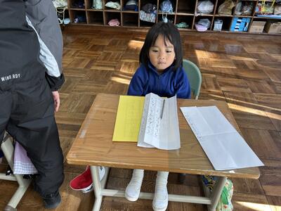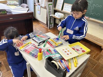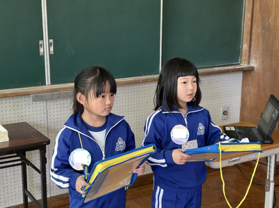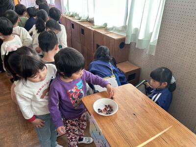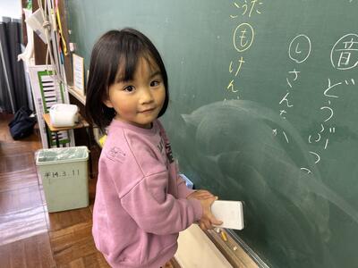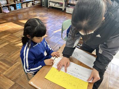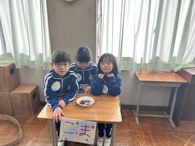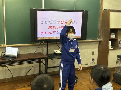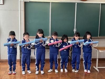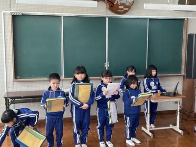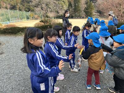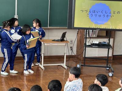今日は綴保育所の皆さんが来校してくれました。1年生との交流会をするためです。1年生はこの交流会のために、おもちゃを作り、歌や鍵盤ハーモニカの練習をし、進行の練習をしてきました。今日の交流会は和やかなものになりました。司会進行もたいへん上手でした。小さい子の面倒もよく見ました。手作りおもちゃでも楽しんでもらえました。保育所の皆さんは「また来たい」と言っていましたよ。今日の1年生の活動は100点満点です。1年生の皆さん、お疲れ様でした。