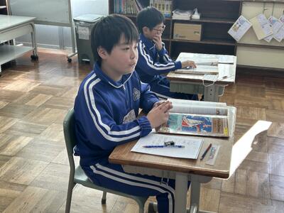 1時間目の国語の時間に2年生は東日本大震災時の写真を集めた動画を見ました。さっきとは表情が変わり、真剣です。