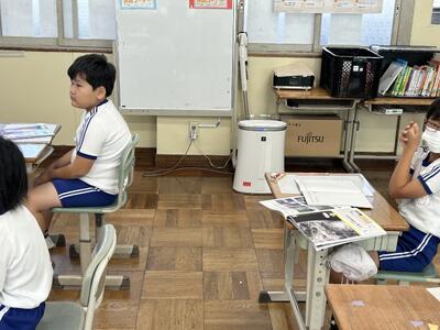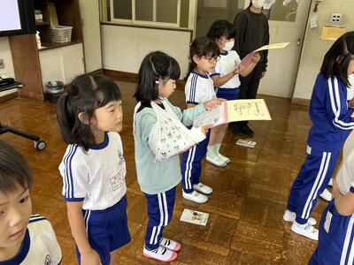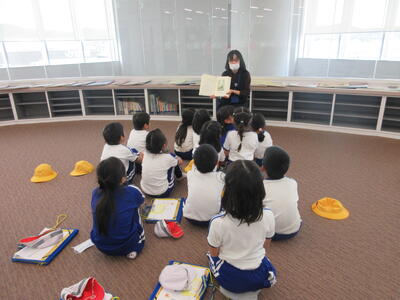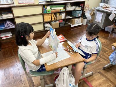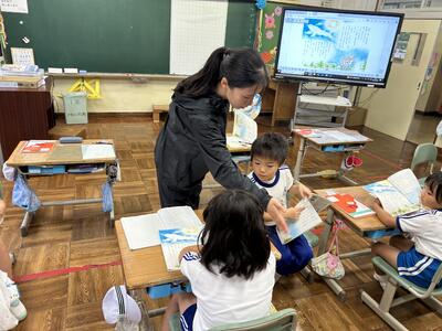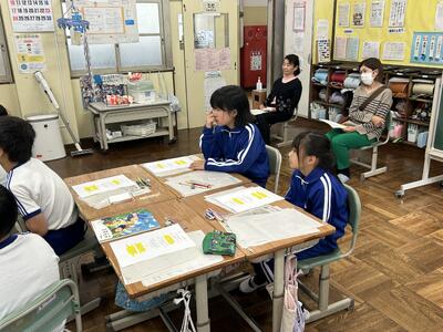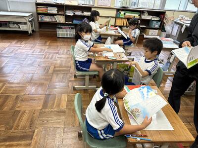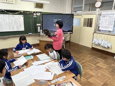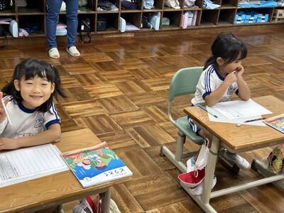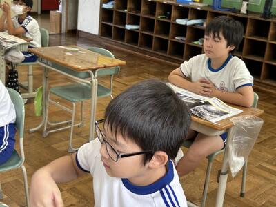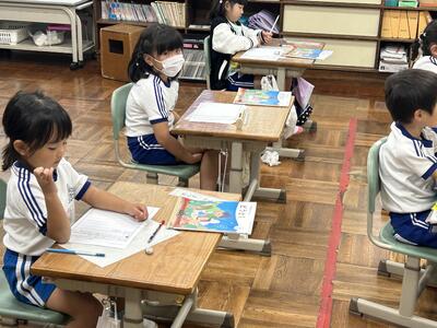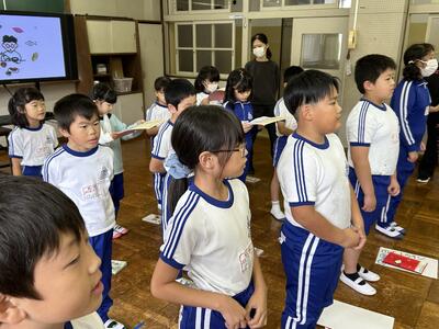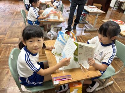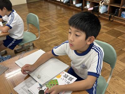 1年生は国語の時間、くじらぐもの音読をペアで行いました。大きな声で上手に読むことができました。