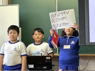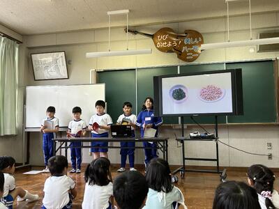 今日の綴小の様子です。今日の児童集会では、国語で大豆のことを学んだ3年生が大豆のことをクイズにして全校生に発表しました。たいへん上手に発表できました。その後、全校生で「小さい秋みつけた」を歌いました。気温が低くなり、秋を感じる1日です。