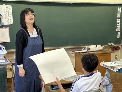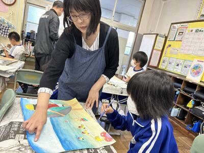 5・6年の図工はゲストティチャーにお出でいただき、授業を行いました。いらっしゃったのは、好間四小の教頭先生である小野知子先生です。もともと先生は中学校で美術を教えていられた絵画の専門家です。その先生に水彩画の色の塗り方などを指導いただきました。子どもたちは目を輝かせて、作品作りに取り組んでいました。小野先生、忙しい中、ありがとうございました。