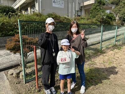 お母さんと担任の先生と1年生児童の写真です。みんなで写真が撮れてよかったですね。