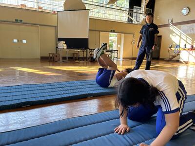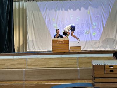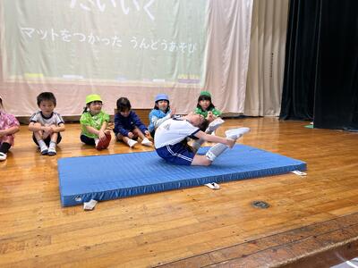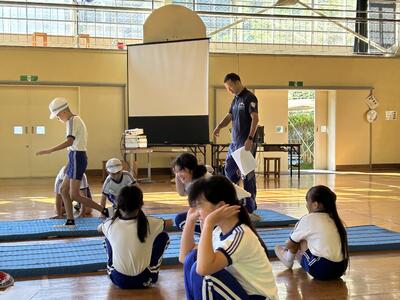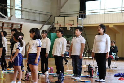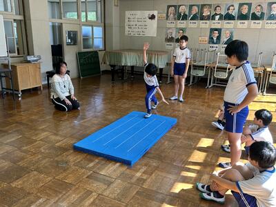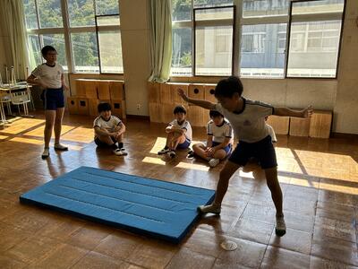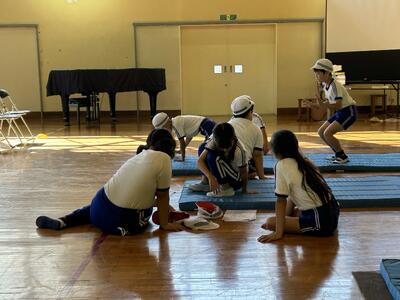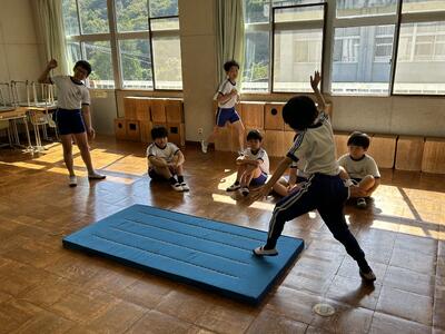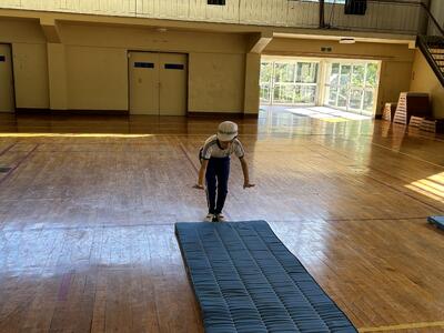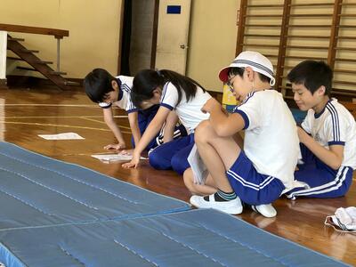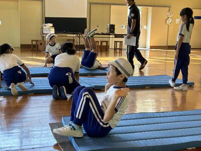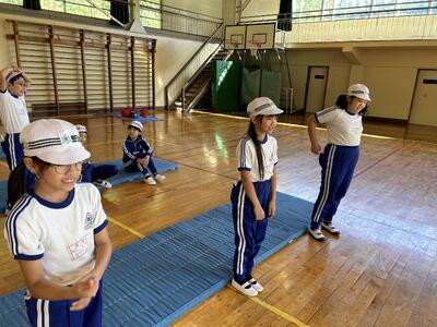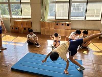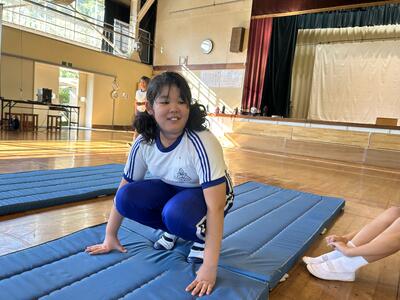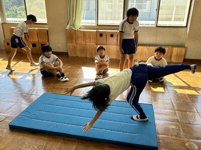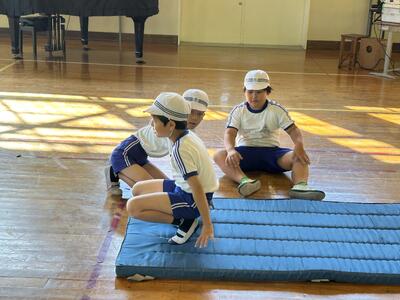 3・4年生はマット運動に取り組んでいます。上手に演技するコツを教えてもらい、練習を開始しました。