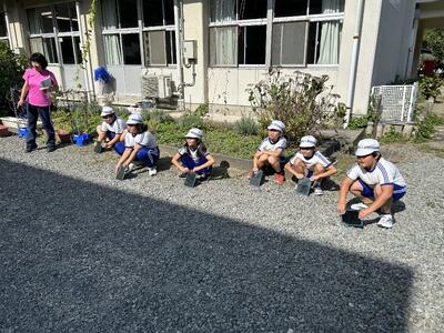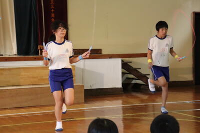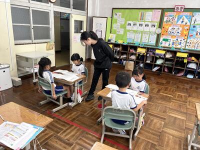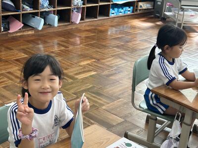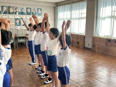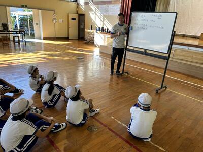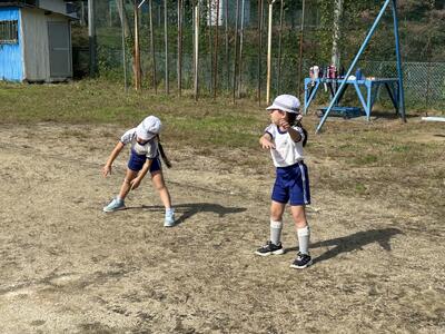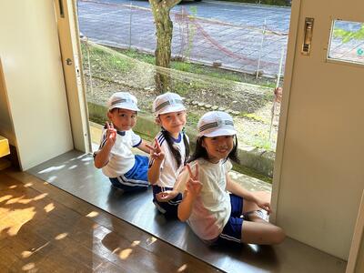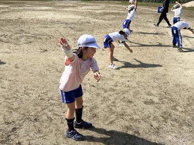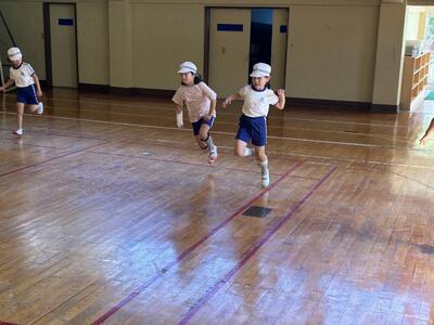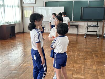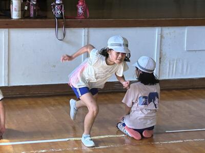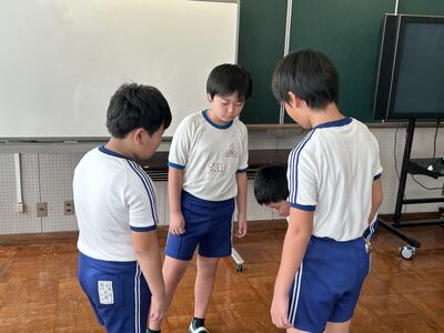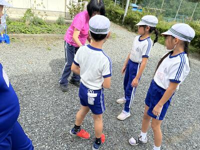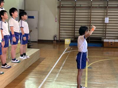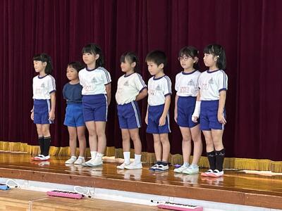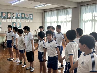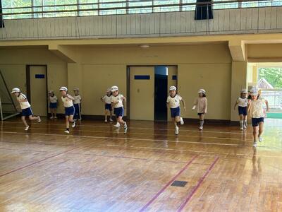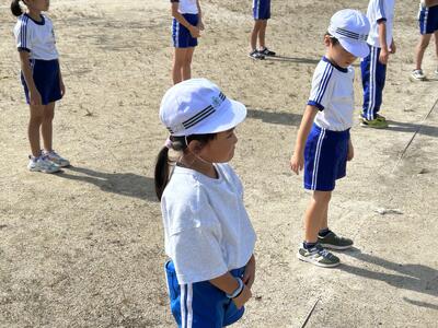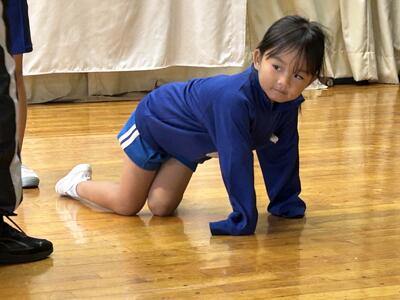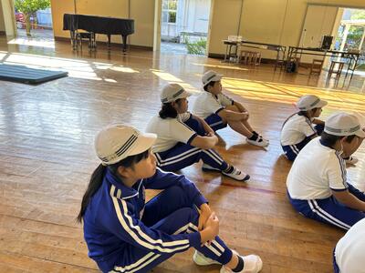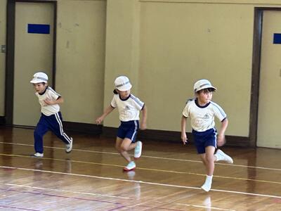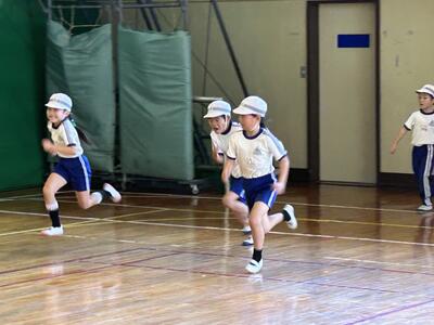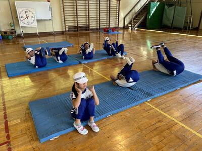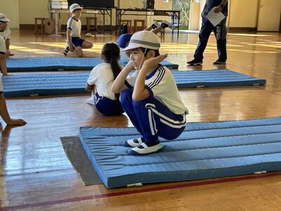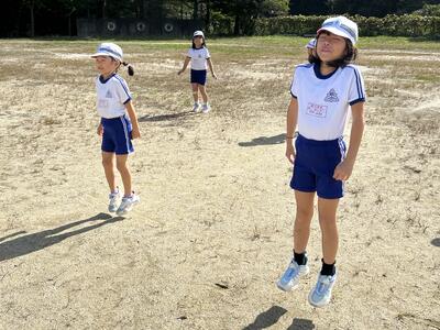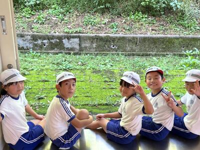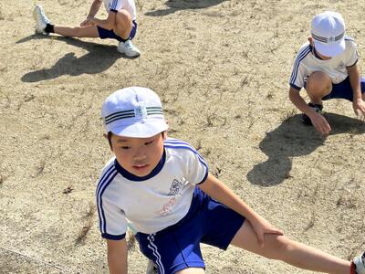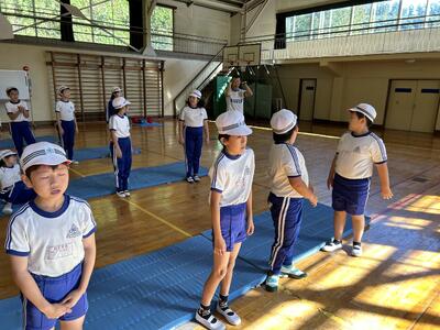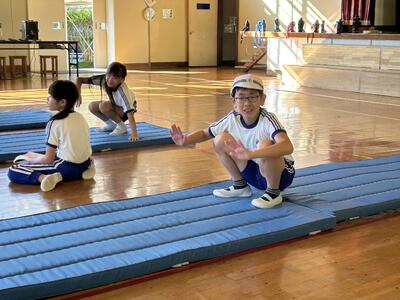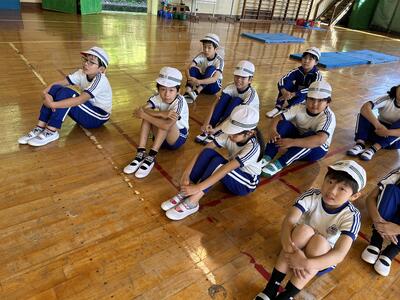 1・2年生の体育です。体作り運動を行いました。授業の合間の休憩の姿もかわいいです。