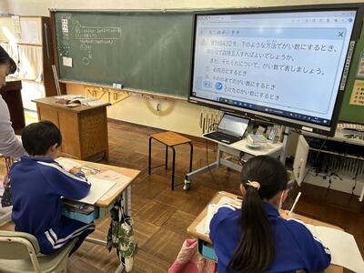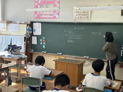 3・4年生は算数を頑張りました。3年生はかけ算、4年生は四捨五入に取り組みました。