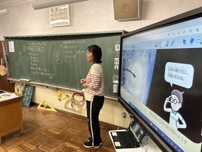 5年生は理科で台風について学習しました。台風の目の天気は晴れだそうです。私も勉強になりました。