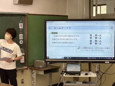 5年生も算数を頑張りました。今日は分母と分子に同じ数をかけても分数の大きさは変わらないことを学びました。