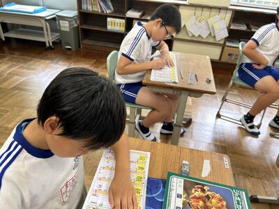 4年生は先日、出かけた見学学習のまとめを行いました。夕月かまぼこ、伝承館で聞いた語り部さんの話を上手にまとめることができました。