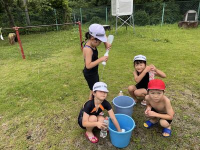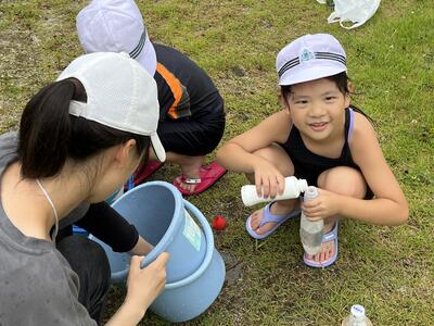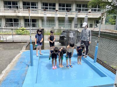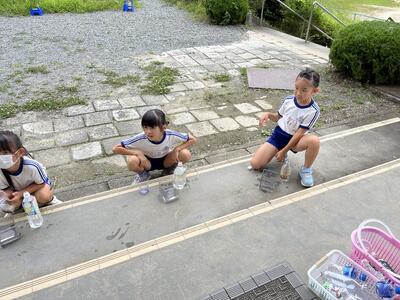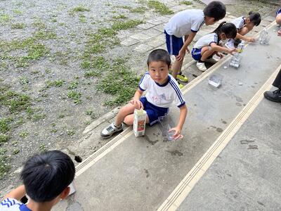 1年生は家から持ってきたペットボトルなどを使って水遊びをしました。校庭を駆け回り、大盛り上がりでした。