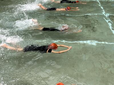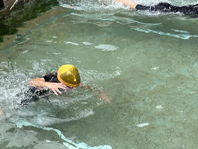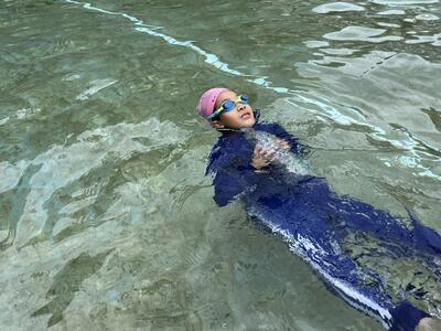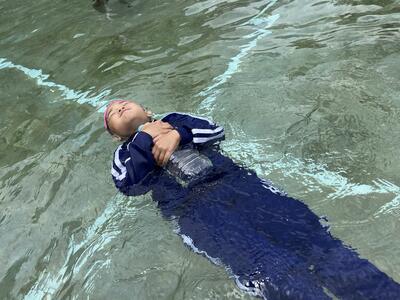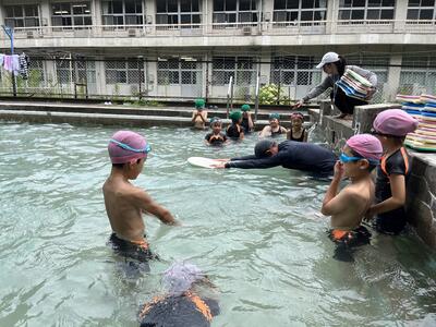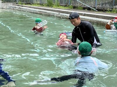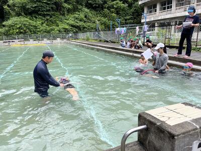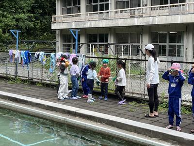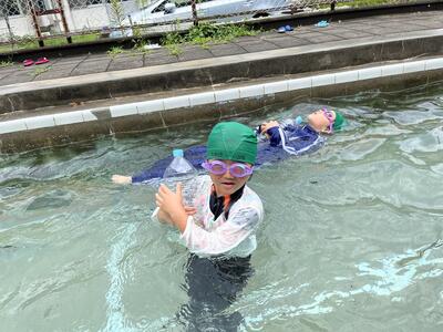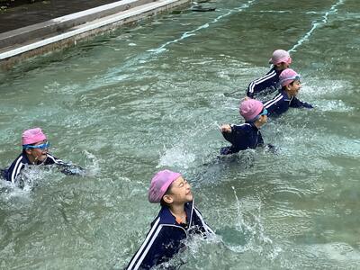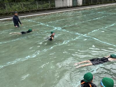 1・2年生は着衣水泳を行いました。万が一の場合を想定しての授業です。子どもたちはペットボトルを使い上手に体を浮かせることができました。