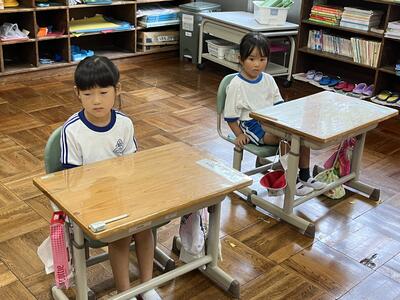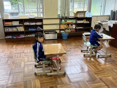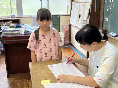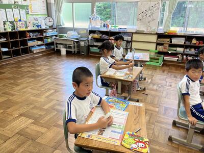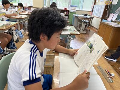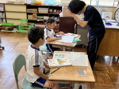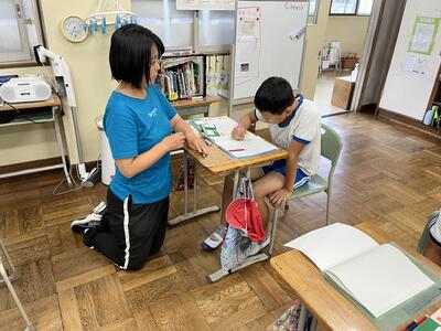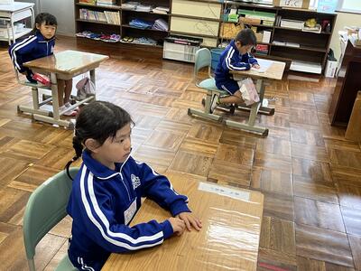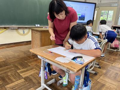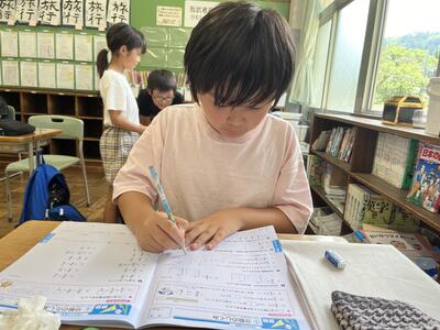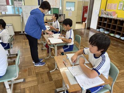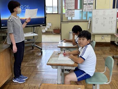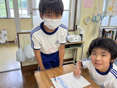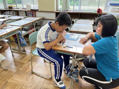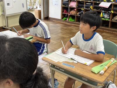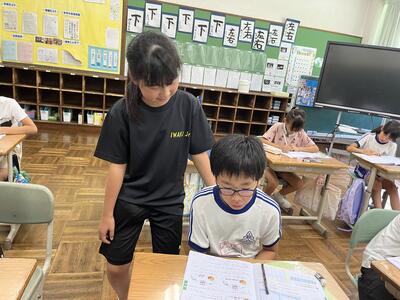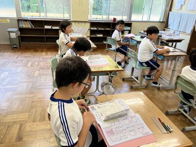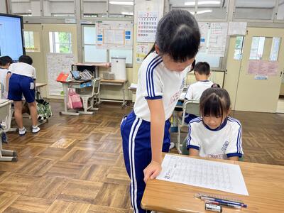 3・4年生は漢字のテスト前、ペアになって確認しました。4年生が3年生に教える姿も見られました。複式のよさだなぁ。