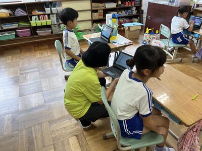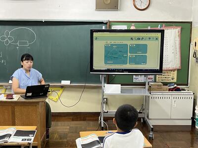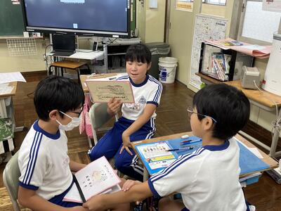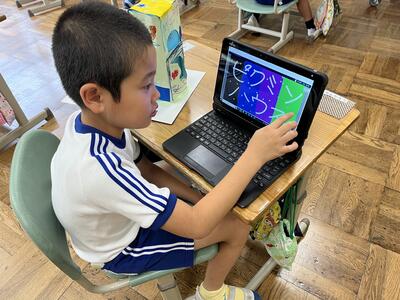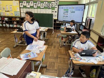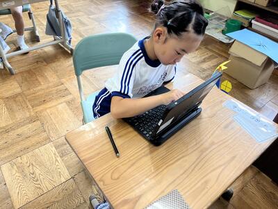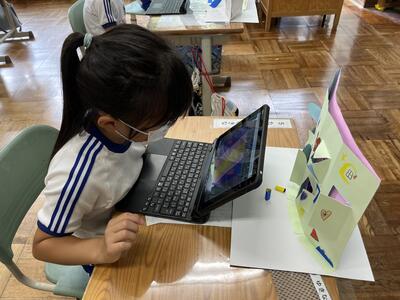 2年生はタブレット端末を上手に使いこなしています。今日はプレゼンテーションソフトで、自分で作った図工の作品のプレゼンをするための資料を作りました。写真や説明の文章をすらすら入力しました。1学期の間、活用してきた成果があらわれています。