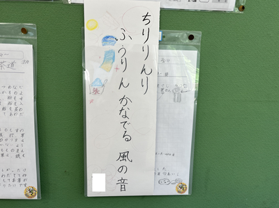 5年生女子の俳句です。暑い夏の日、風鈴の音は暑さを忘れさせてくれるものです。今日も暑さが厳しい1日です。なぜか風鈴の音で涼んでみたくなりました。この俳句にはいくつかの技が使われています。「ちりりんり」という擬音語、「風鈴 かなでる」という擬人法、そして「風の音」で終わるので、体言止めと中学校で学習する内容を盛り込んでいます。テレビ番組で俳句を詠むものを見たことがありますが、まさにこの句は才能ありです。