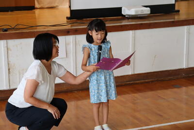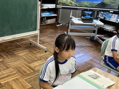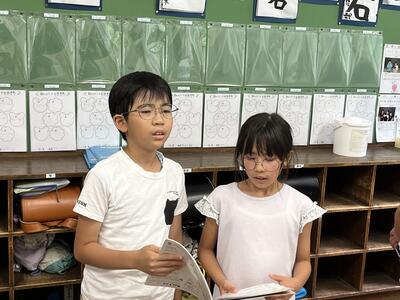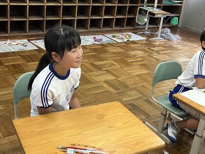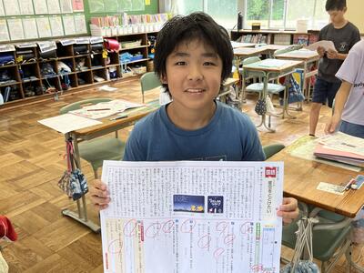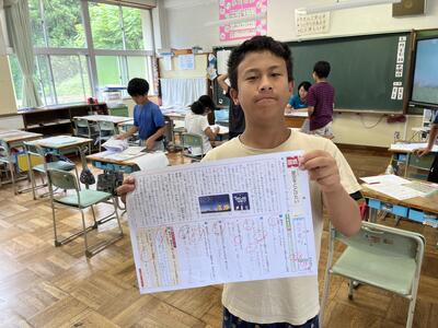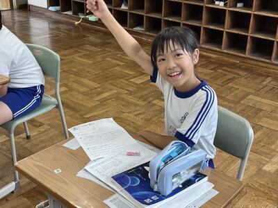 私は1学期にうれしいことがたくさんありました。1つ目は新しい1年生と仲良くなれたことです。放課後、一緒に遊んだり、縦割り班で活動して仲良くなりました。1年生はとてもかわいいです。2つ目は総合的な学習で炭坑のことを調べたからです。「ズリ山」「炭坑住宅」など疑問に思うことが山積みだったのですが、ヘリテージツアーの菅野さんたちに教えてもらい、いろいろな知識を得ることができました。3つ目は4月から6年生と一緒のクラスになり、私は「優しさ」「助け合う心」を学びました。6年生は誰かが困っていると助けてくれます。それを見たみんなもかけつけてくれるので、私もそんな6年生になりたいなぁと思うようになりました。夏休みには1学期に習った回転櫓の盆踊りをみんなで楽しく踊りたいです。そして2学期も楽しく元気に過ごしたいです。