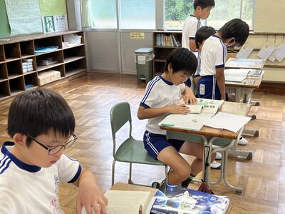 5年生は本の紹介文を作るために本を熱心に読みました。気になるところに付せんを張って後で活用できるようにしていました。