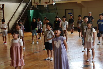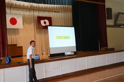 今日で1学期は終了です。綴の子どもたちはこの1学期に様々なことを学び、心も体も成長しました。今日の終業式では、1学期頑張ったことをスライドを使って振り返り、夏休みに守ってほしいことを校長が全校生に話しました。夏休みの合い言葉は「つなごはん」です。この「つなごはん」を少し、外国語風にして「つ な ご は あん」にして子どもたちと音読しました。