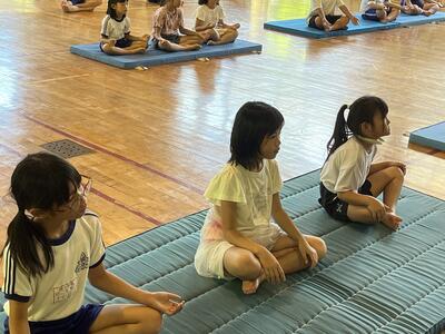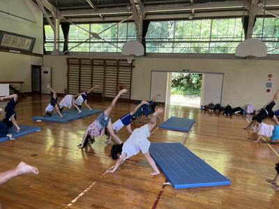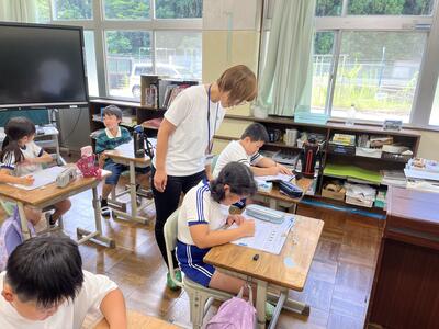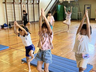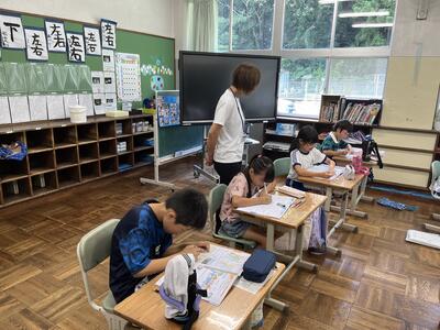 今日は福島県のサポートティーチャーの制度を活用して、綴小学校夏休み学習会を行いました。たくさんの児童が参加して、夏休みの宿題を行い、そして暑い中でしたが、ヨガで体を動かしました。本日、サポートティーチャーとして、指導していただいたのは、吉田先生と遠藤先生です。子どもたちは自学自習をしながら、疑問点などを個別に教えてらいました。宿題もだいぶはかどったようでした。途中でお互いに宿題を教え合う姿も見られ、わきあいあいとした雰囲気の学習会でした。