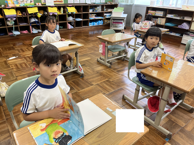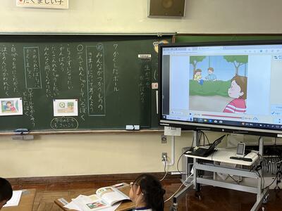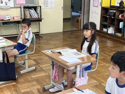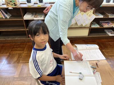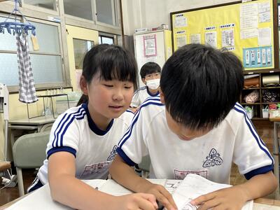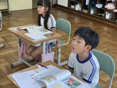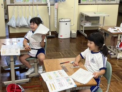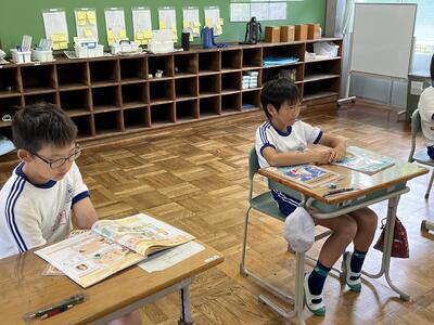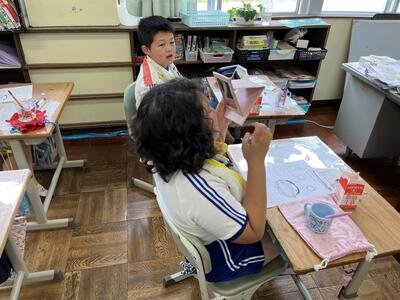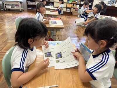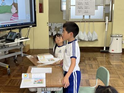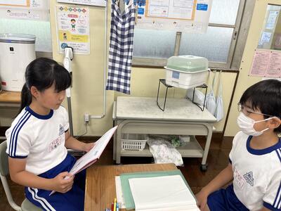 さて1年生は仲良くペアで学習しました。今日は友だちに本の内容を紹介しました。わかりやすく説明することができたようです。