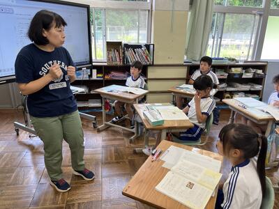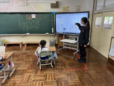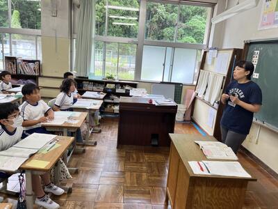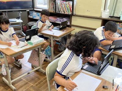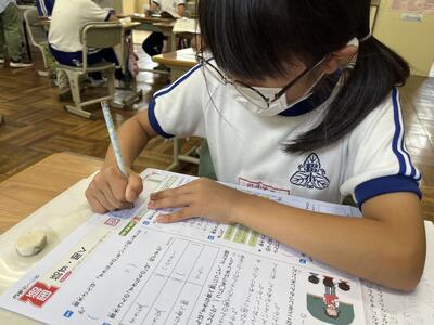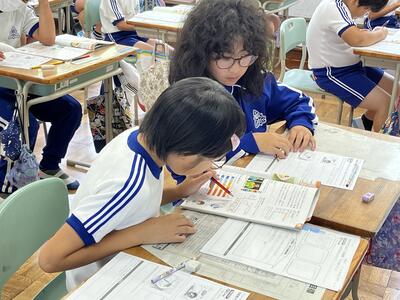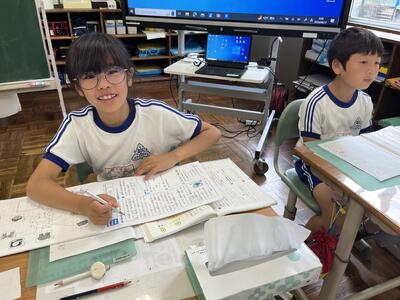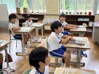 3・4年生は俳句の学習を行っていました。きょうはいよいよ俳句を詠みました。「イルカはね キラリな水を みな浴びる」「山の中 桜がきれい ピンクいろ」「友だちと 庭のホースで 水遊び」「妹が チューリップの花を ながめてる」などたくさんの名作が生まれました。