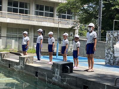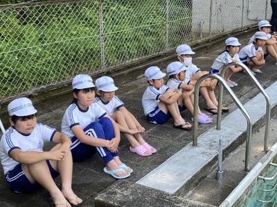 今日は1・2年生がプールに入りました。準備運動をしっかり行い、いざプールへ。1年生にとっては初めてのプール歓声を上げながら、入水しました。まだ少し水は冷たいようでしたが、小学校での初泳ぎを楽しみました。