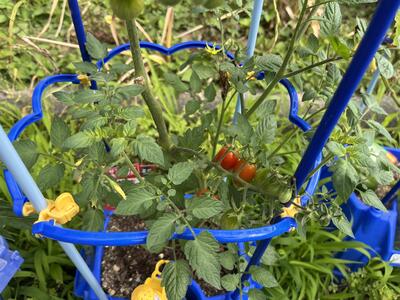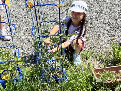 トマトの収穫がやっとできました。2年生女子、大喜びです。