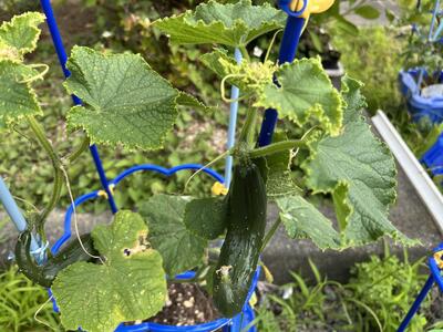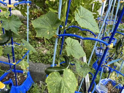 2年生が育てている野菜が実りました。お店で売っているキューリとは少し形が違いますが、立派な実をつけました。今日、収穫だそうです。子どもたちも一生懸命に育てましたが、担任の先生は休日も学校へ来て、水やりなどをしていました。綴小学校の先生方は見えないところでも子どもたちの笑顔のために頑張っています。