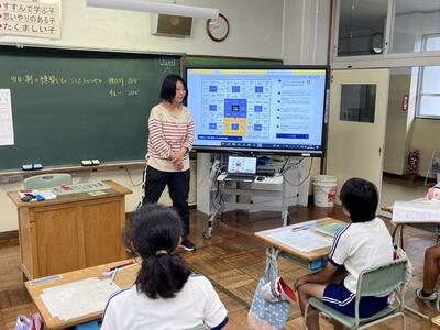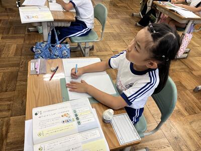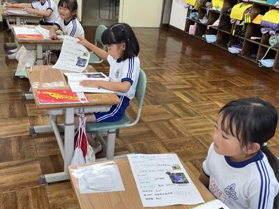 1年生はSSSさんへのインタビューも行いました。「好きな色は?」「好きな動物は?」たくさん質問して、学習プリントに記入することができました。