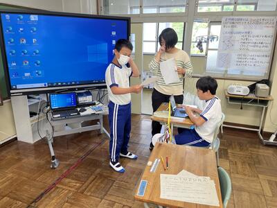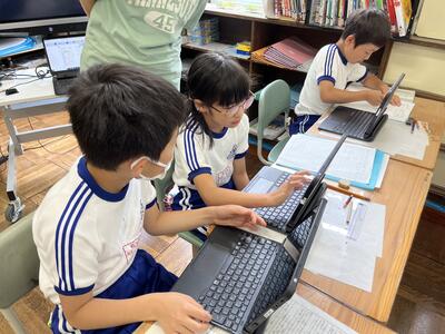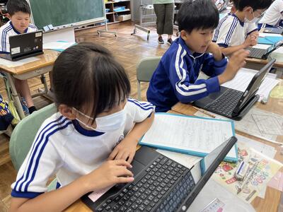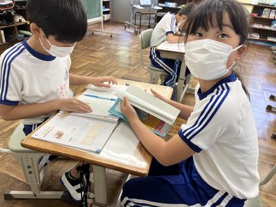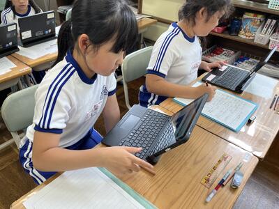 3・4年生はタブレットを使って、ペアになって回転櫓について調べました。