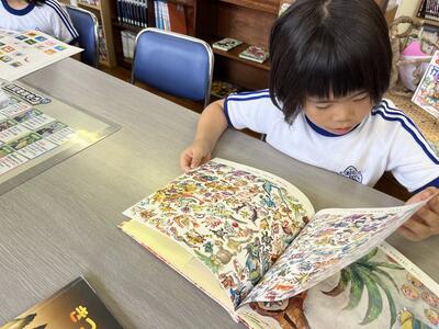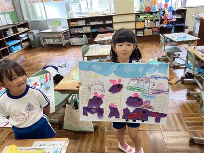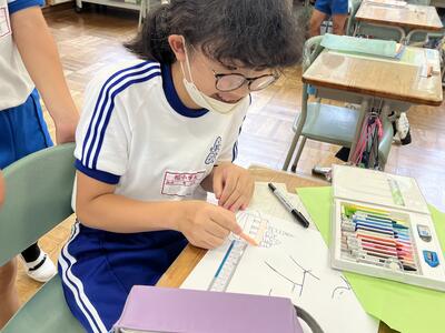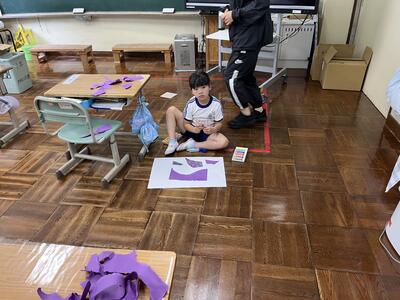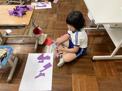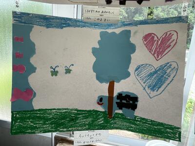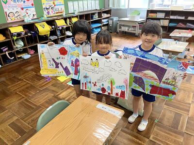 1年生は図工で切り絵に挑戦しました。それぞれに自分の好きな動物を切り絵で表現しました。ハムスター、きりん…。たくさんの動物が絵の中に登場しました。