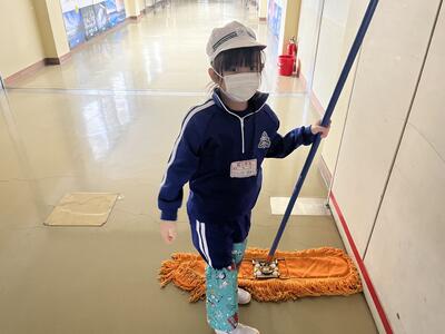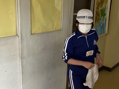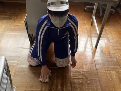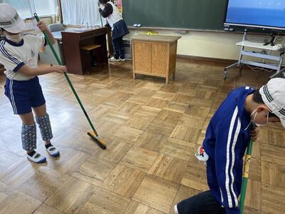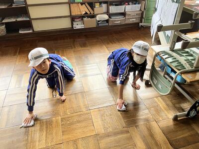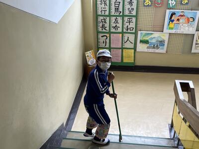 綴小学校では縦割り班で清掃を行っています。少ない人数ですが、1年生から6年生まで協力して行っています。上級生は下級生の面倒を見ながら、すみずみまできれいに清掃しています。