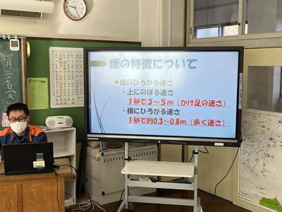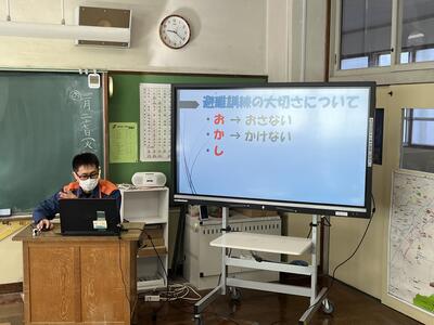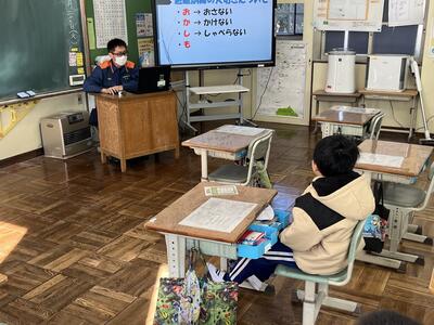 今日は防火教室が行われました。3・4年生が内郷消防署の方から「おかしもち」(おさない、かけない、しゃべらない、ちかづかない)の大切さや煙の怖さについての説明を受けました。