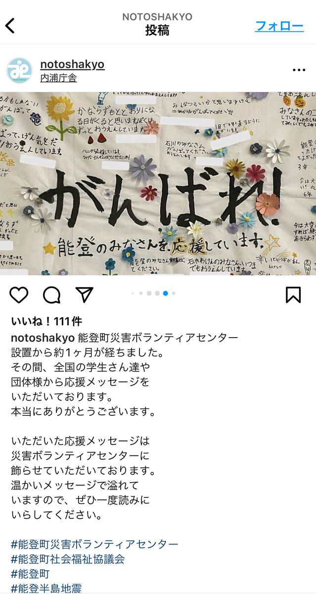 能登社会福祉協議会のSNSに綴小学校からの応援メッセージが記載されていました。綴小の子どもたちのメッセージが被災された方のことを励ましていることを知り、心が温かくなりました。能登の皆さん、春はもうすぐです。頑張ってください。綴小学校一同、応援しています。