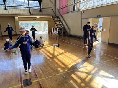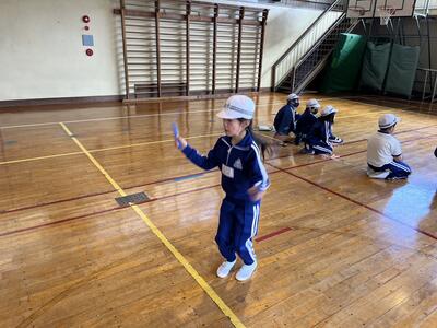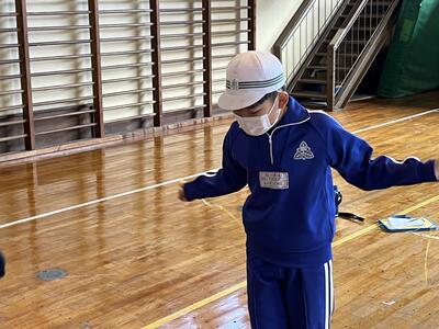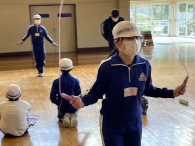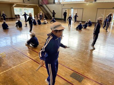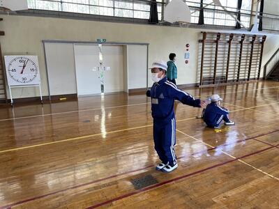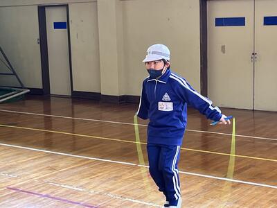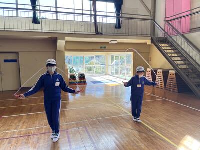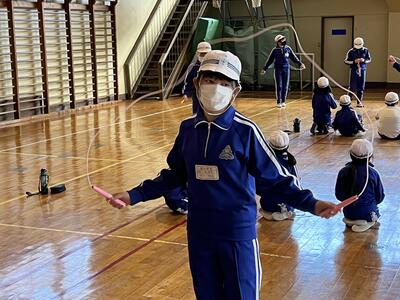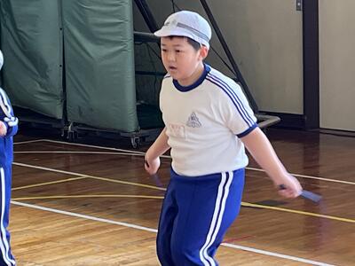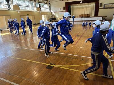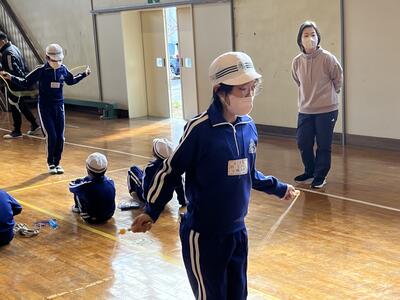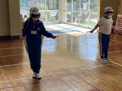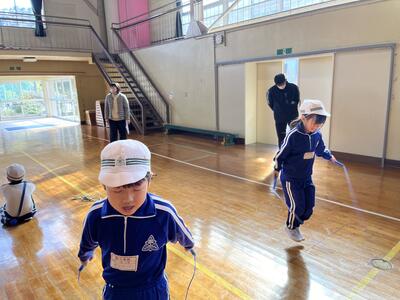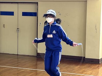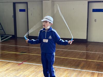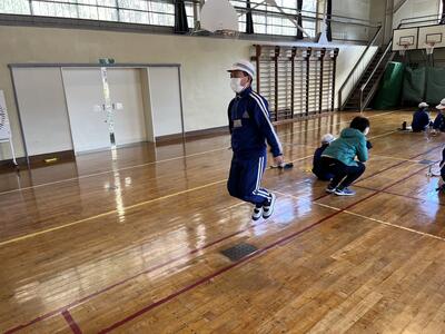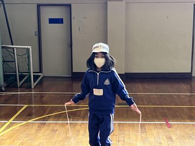 いよいよなわとび記録会のスタートです。個人でのスピード跳びや得意な技の披露を行いました。みんな、この日のために頑張ってきたので一生懸命に跳びました。準備運動が終わったら、本番です。スピード跳びでは記録更新を目指しました。