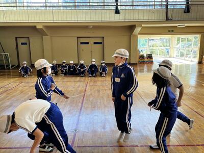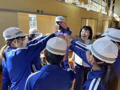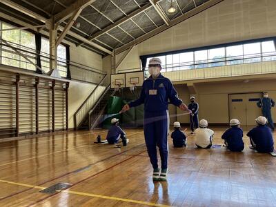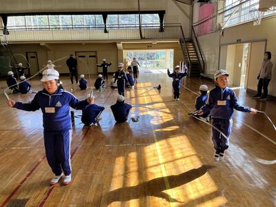 6年生はみんなで気合いを入れてから長なわとびを行いました。担任の先生も気合いが入っています。
