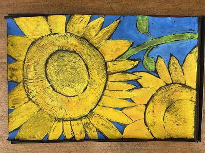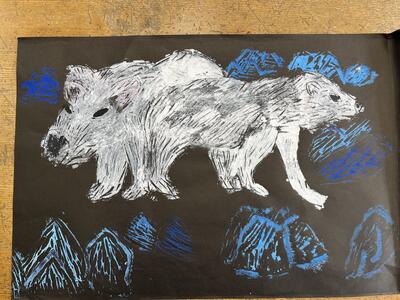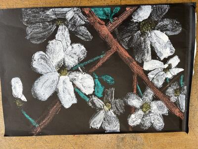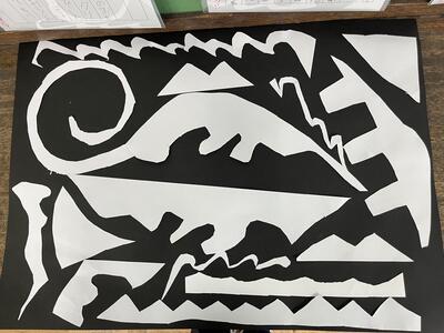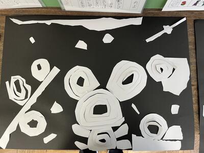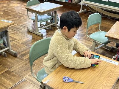 2年生の図工の作品です。まだ完成前ですが、切り抜いたものがいろいろなものに見えます。私にはミッキーマウスや恐竜に見えたのですが…。何が出来上がるのでしょう。
