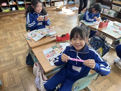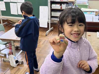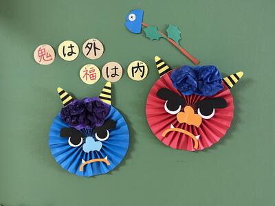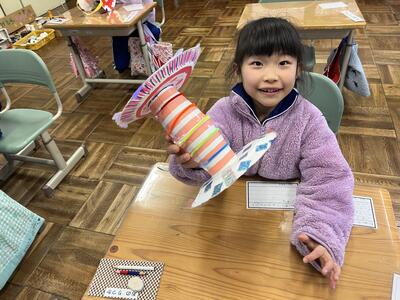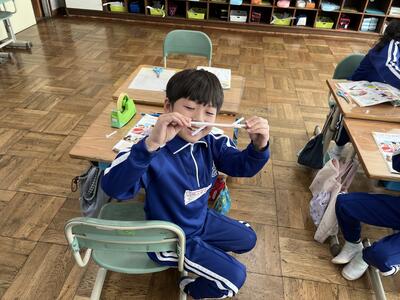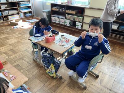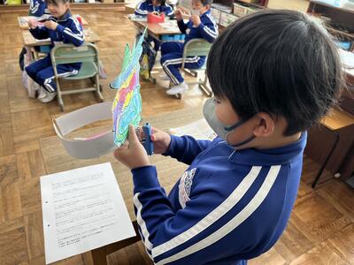2年生の図工の様子です。鬼のお面の色を塗ったり、ストローでおもちゃを作りました。